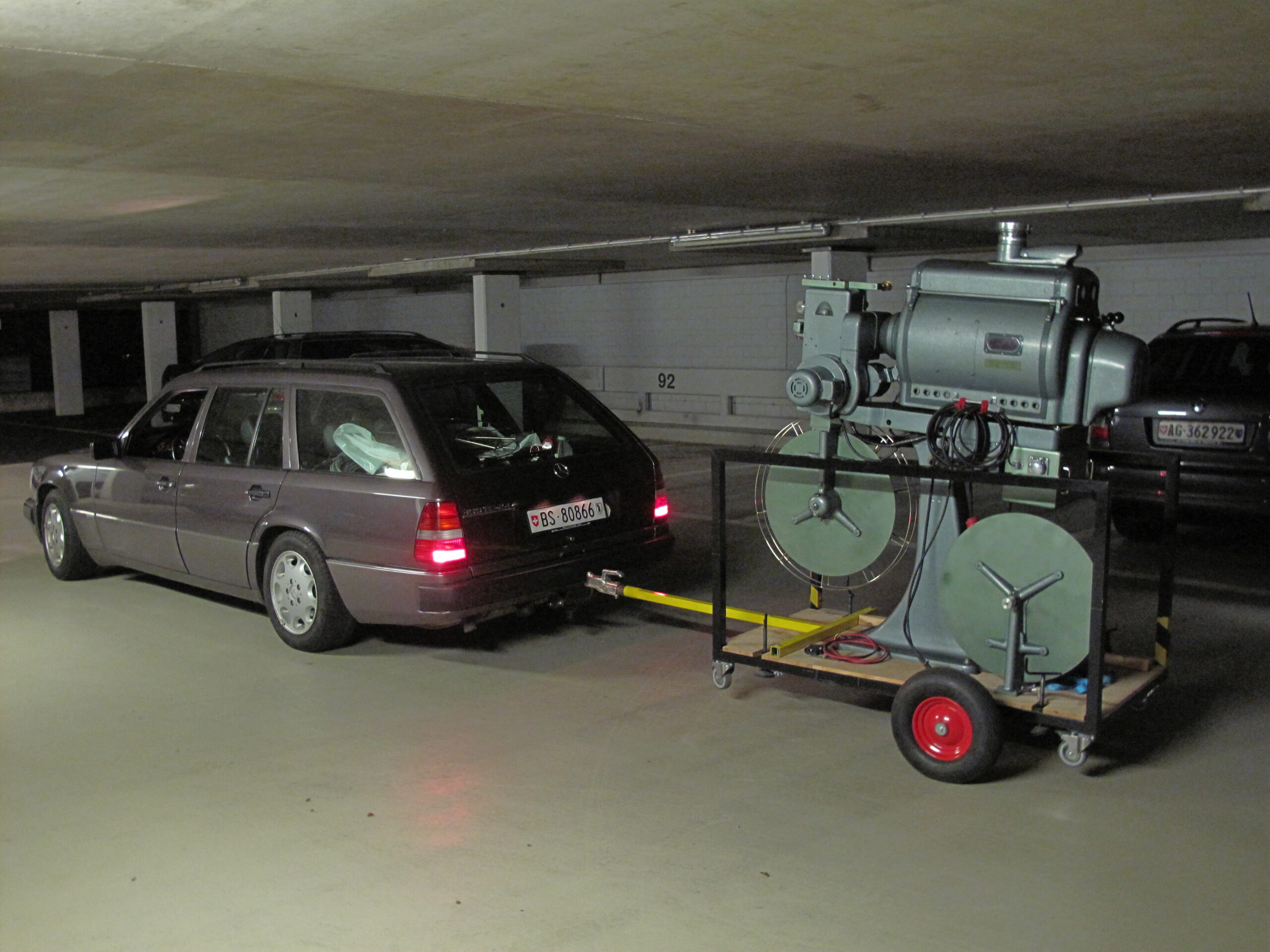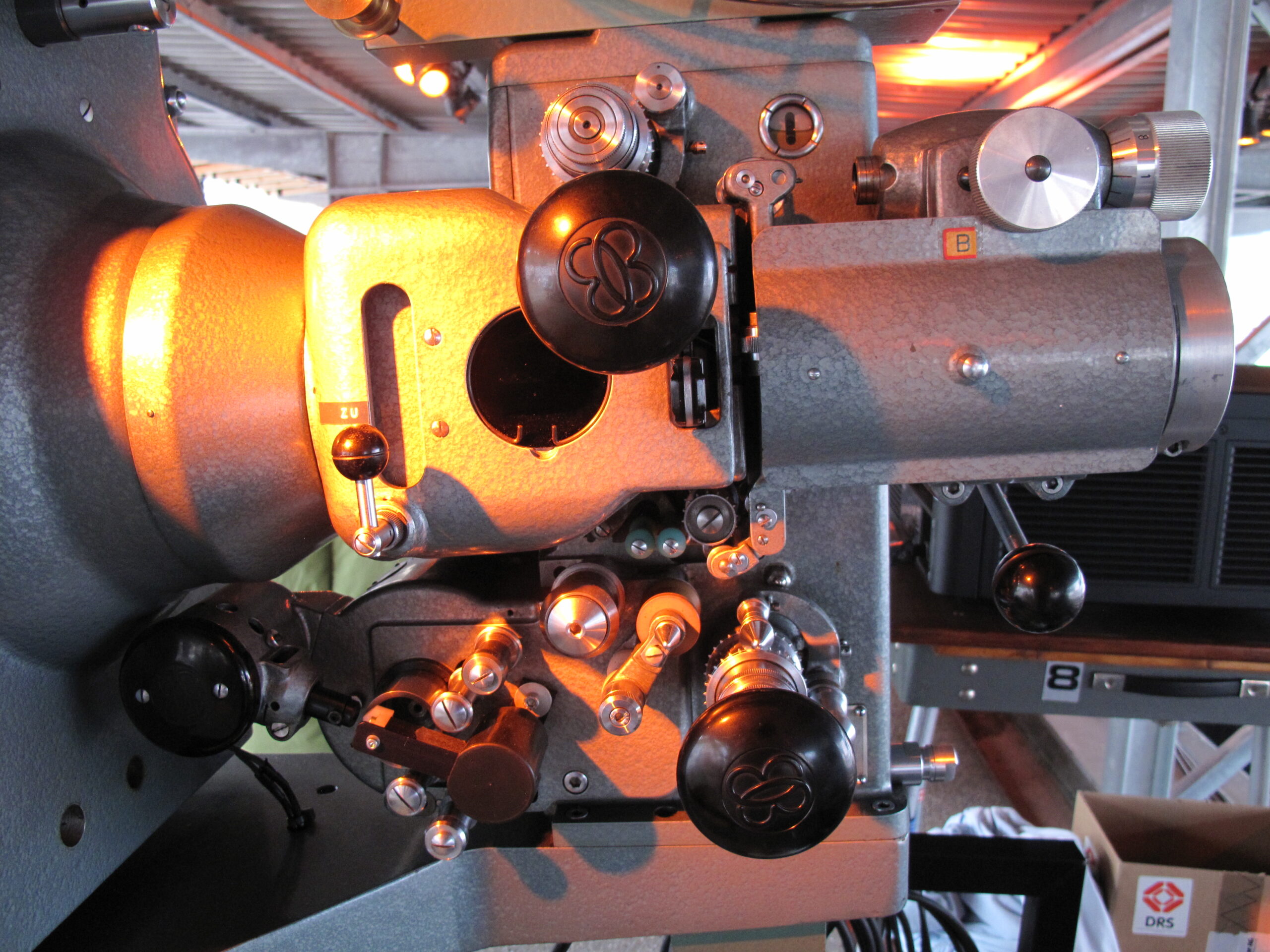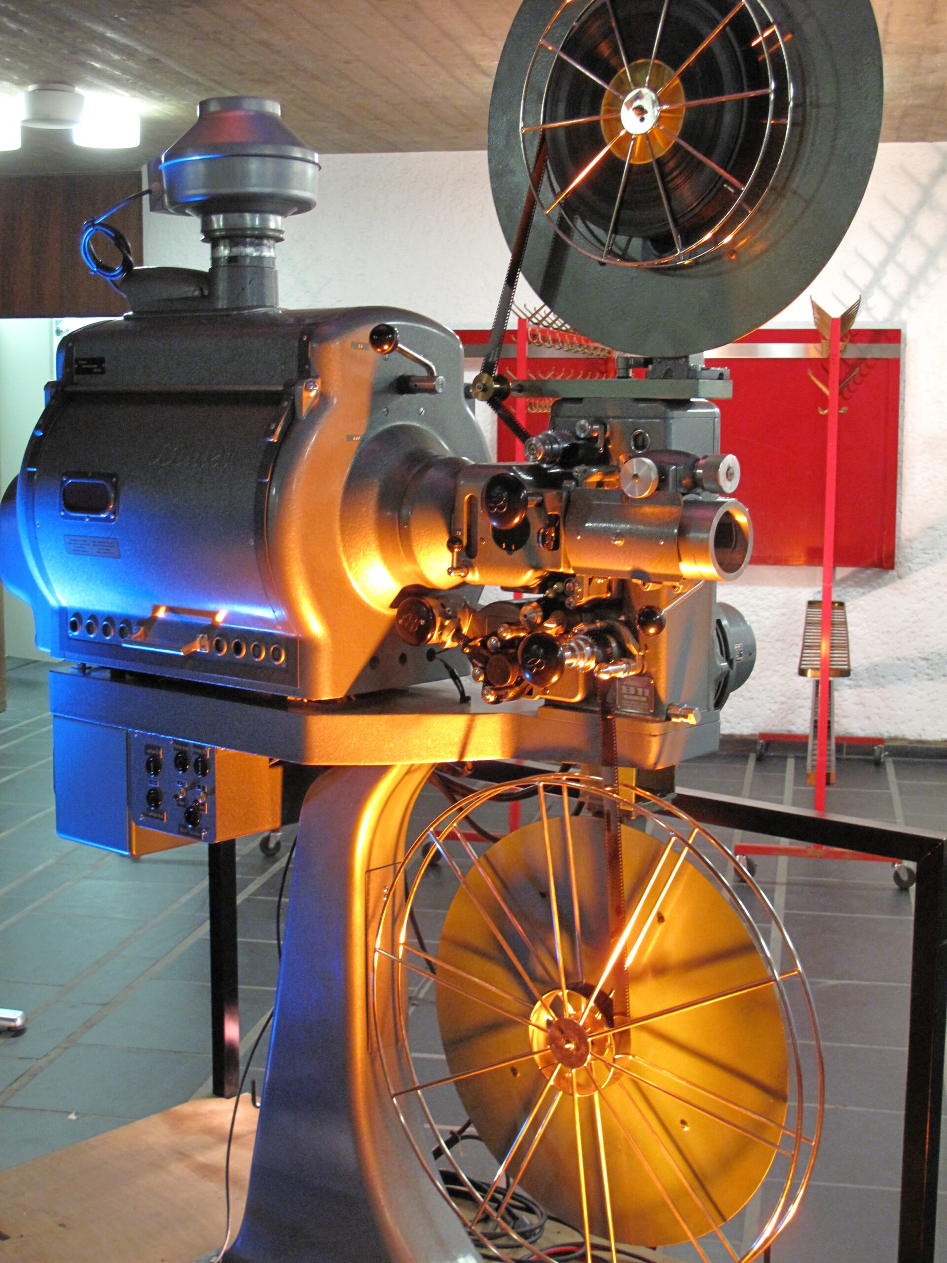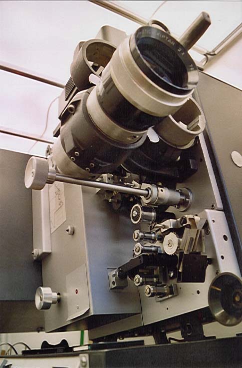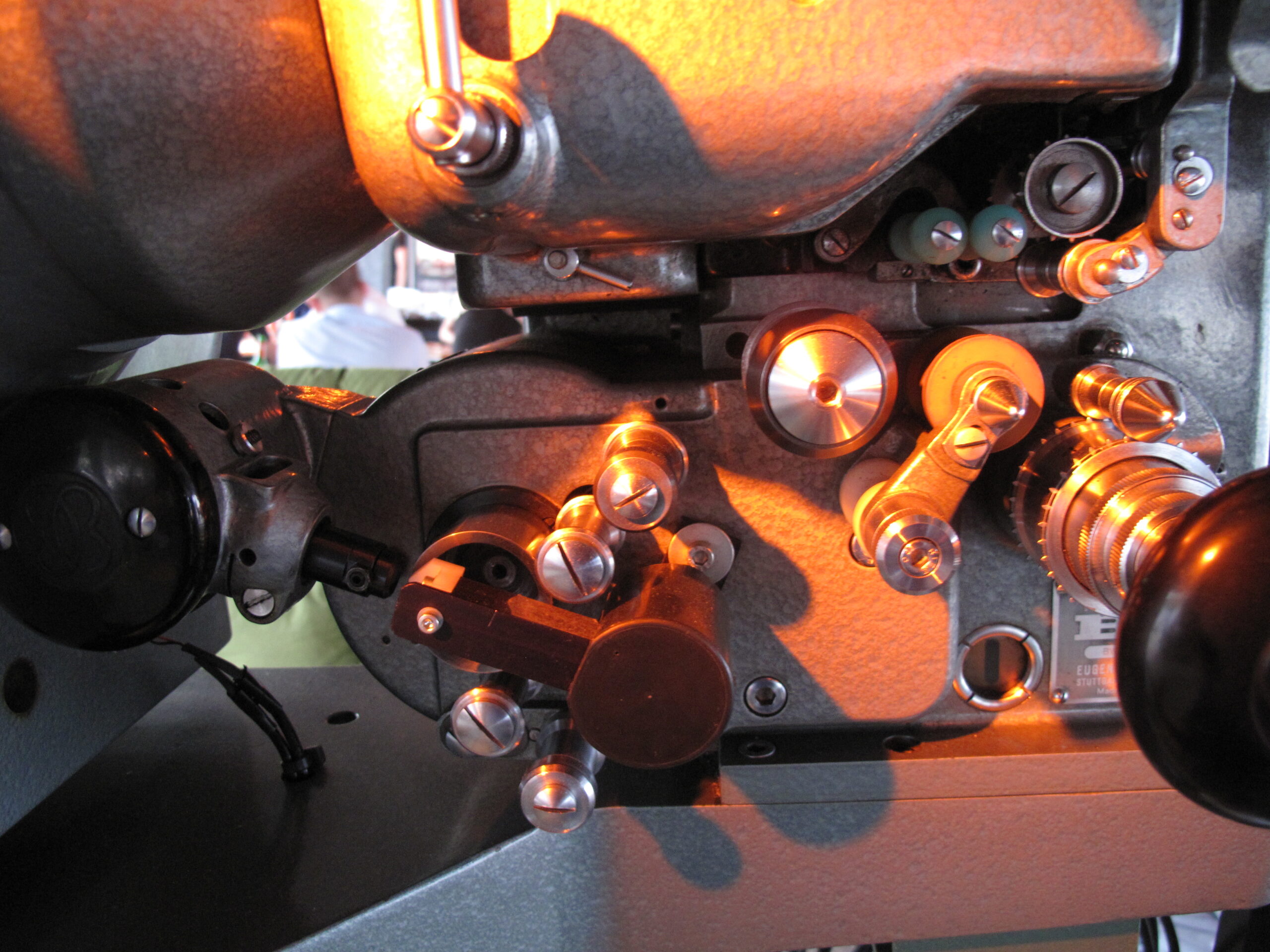 Filmprojektor: Die Filmrolle wird in einen mechanischen Filmprojektor eingelegt. Ein spezieller Mechanismus, oft ein "Malteserkreuz", zieht den Film in ruckartigen Schritten am Bildfenster vorbei.