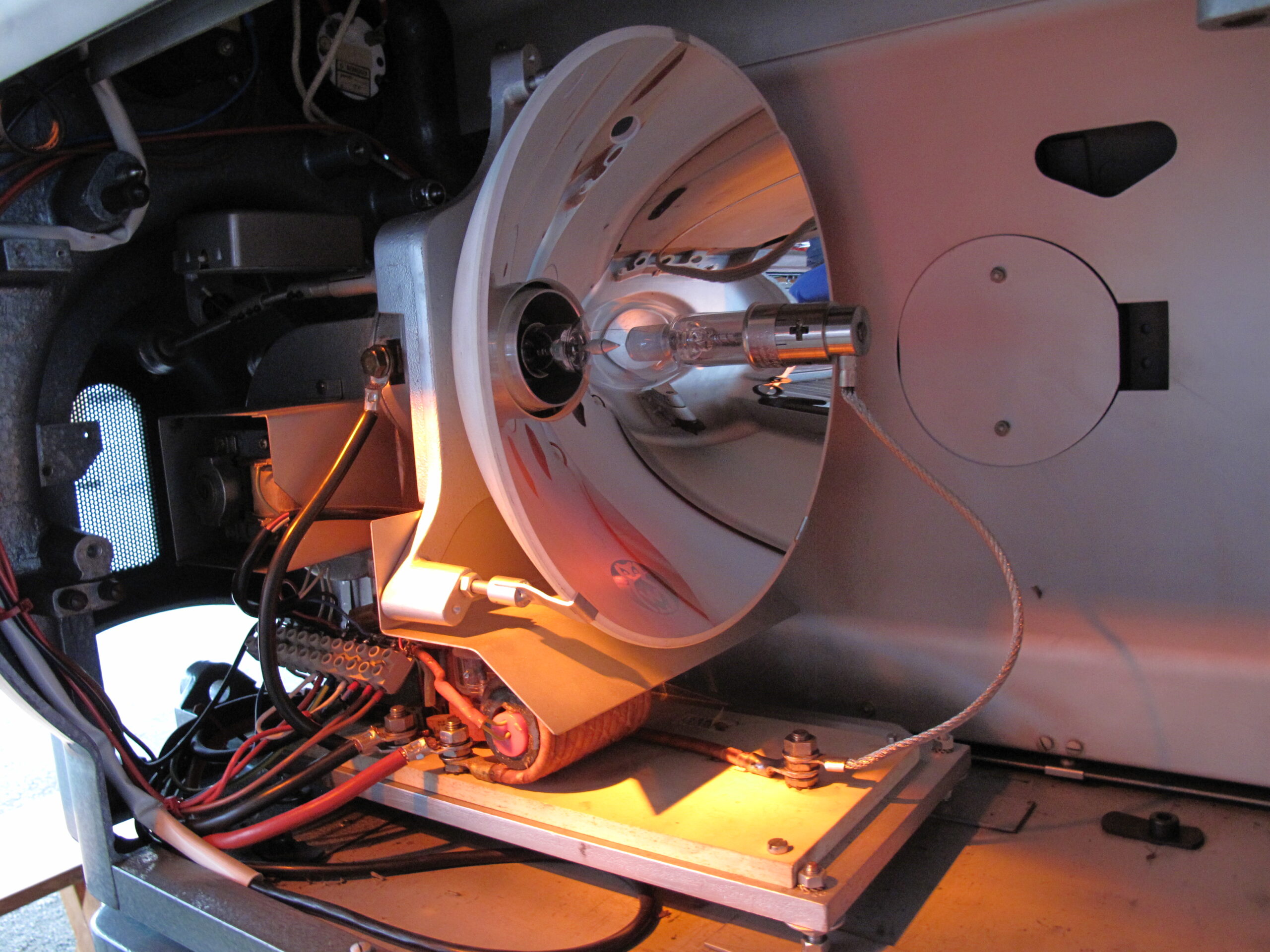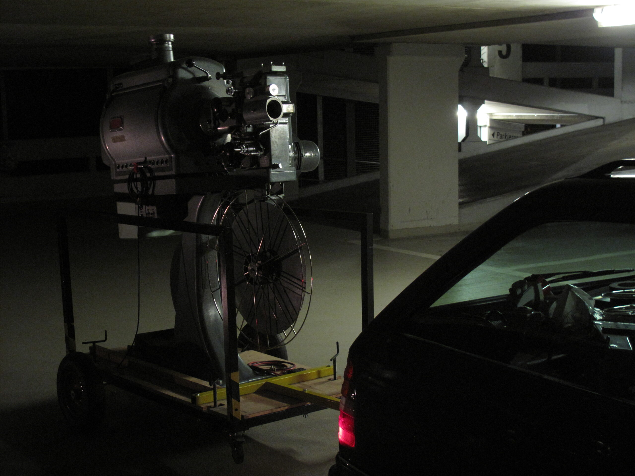 Projektionsvorgang: Eine starke Lichtquelle (meist eine Xenonlampe) leuchtet durch den Filmstreifen. Ein Umlaufverschluss ("Blende") sorgt dafür, dass nur stehende Bilder auf die Leinwand projiziert werden, während der Filmstreifen weiterbewegt wird.